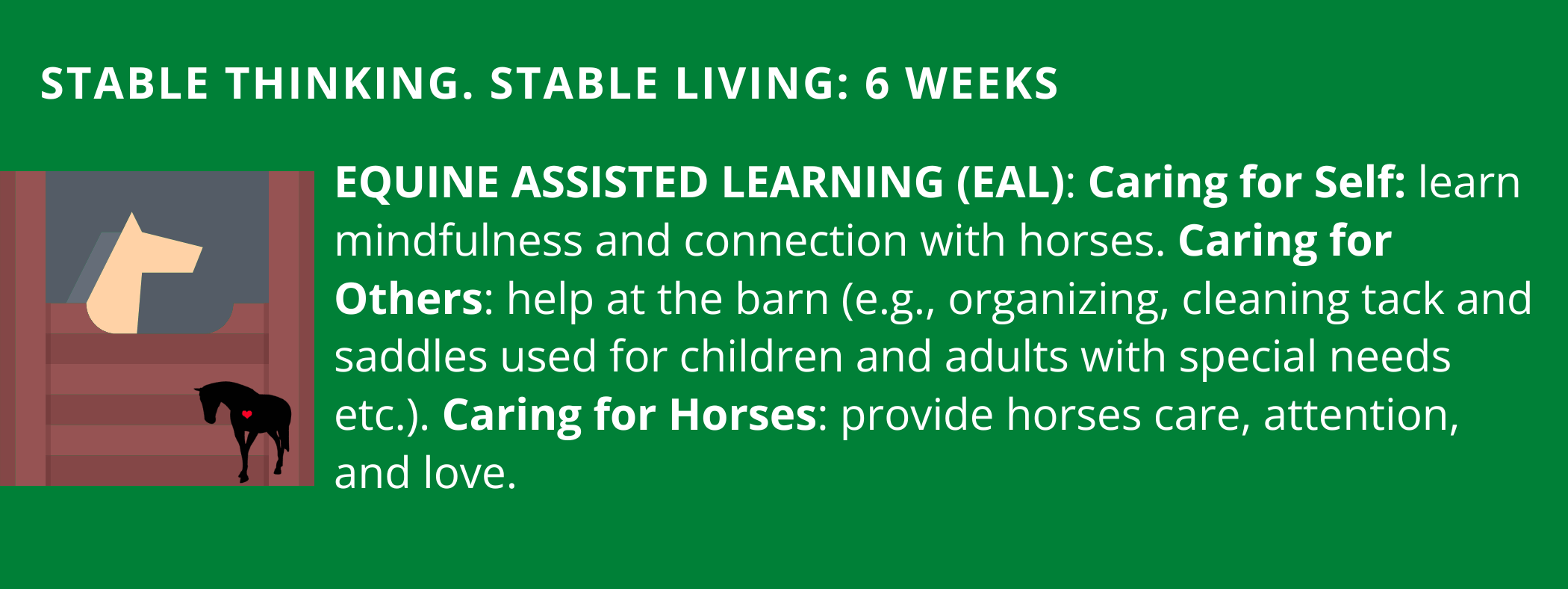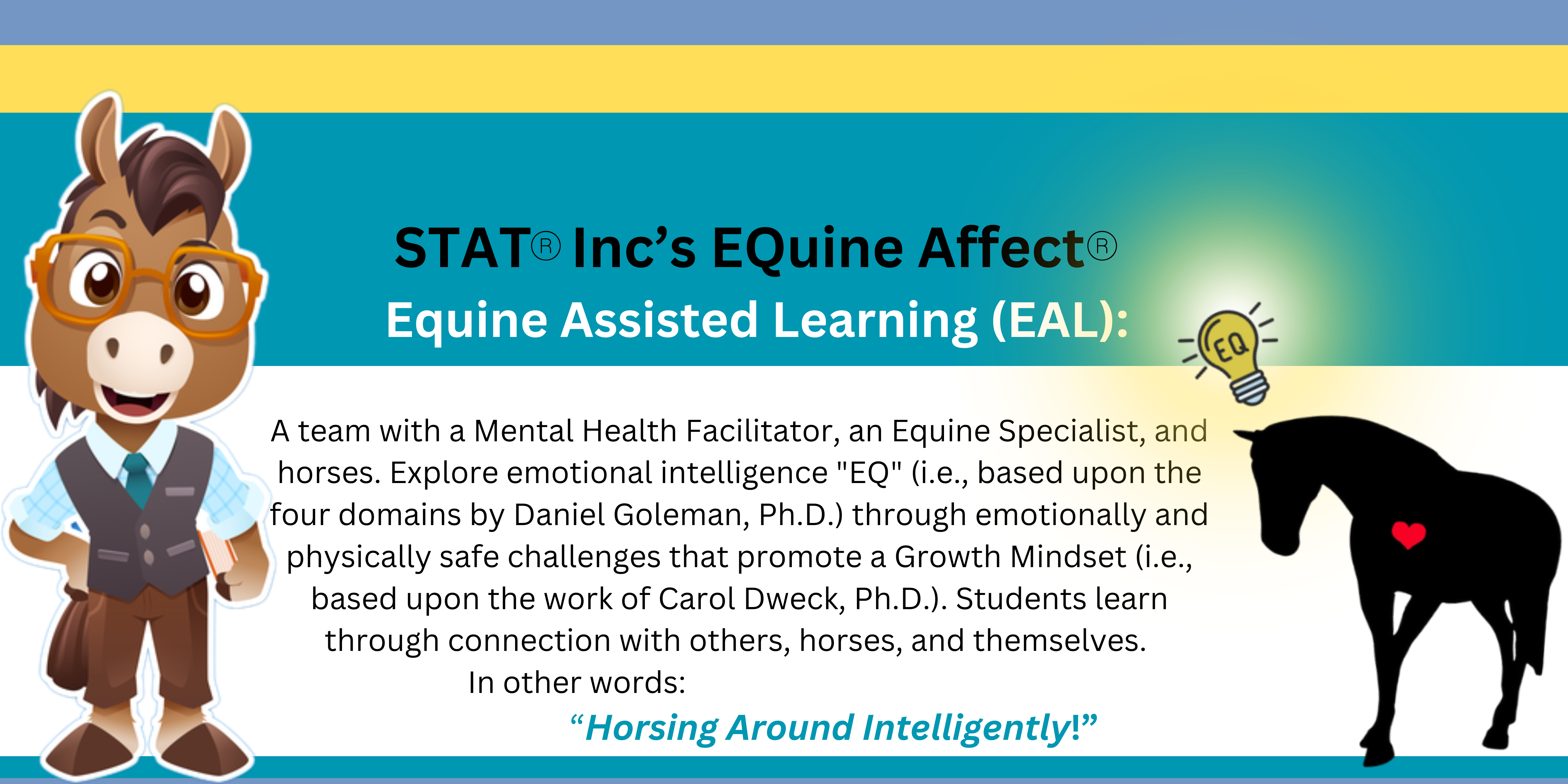 STAT® Inc Staff, Cat Markosky (CEO) and Mel Jenkins-Fernandez, Psy.D., created the EQuine Affect® (EQA), which is an innovative ground-based (no riding) program for your child or teen to learn alongside horses and experience connecting with horses and others through structured, fun, and safe activities. STAT® Inc provides programming for your child or teen to learn alongside horses and experience connecting with horses through structured, fun, and safe activities. Our Team approach includes EQA trained facilitators (i.e., with mental health backgrounds and multiple training modalities to include EAGALA, OK Corral, and EquiLateral to name a few) to provide emotionally safe ways to learn without the pressure to be perfect and Equine Specialists to ensure physical safety of both people and horses. This is a ground based program. We embrace learning from a growth mindset to try new things and explore solutions with confidence.