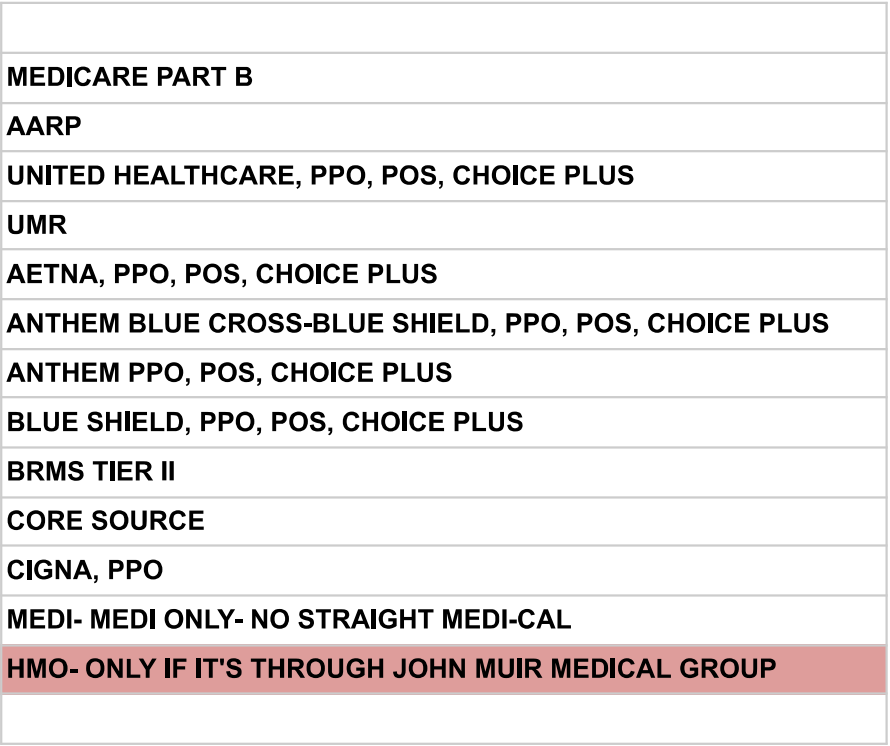 The following is a list of insurance companies that East Bay Foot Clinic, Inc. is contracted with. If you don't see your specific plan or product below, please contact our office at 925.474.4519 or 925.474.4513 prior to a scheduled visit to check if you're covered or that East Bay Foot Clinic, Inc. is a participating provider with your insurance plan. Please note all the John Muir HMO plans require a referral from a referring physician. The referral will need to be obtained prior to treatment.